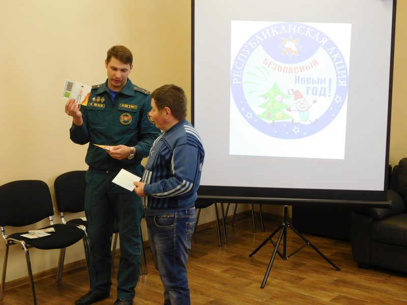 На первом этапе республиканской акции «Безопасный Новый год!» инспектор группы пропаганды и взаимодействия с общественностью Краснопольского районного отдела по ЧС Сергиевич Дмитрий выступил в отделении дневного пребывания для инвалидов Краснопольского районного центра социального обслуживания населения.