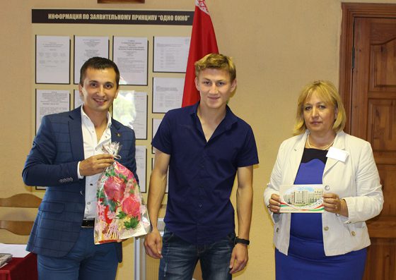 Молодого избирателя приветствовали председатель избирательной комиссии Л.А. Шелепнева и первый секретарь РК ОО «БРСМ» Д.В.Кустов. Поздравляя с этим особенным в жизни Марата событием они вручили ему  памятный сувенир и поздравительную открытку.
