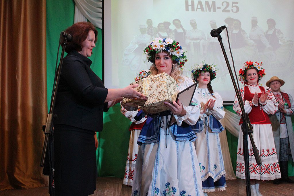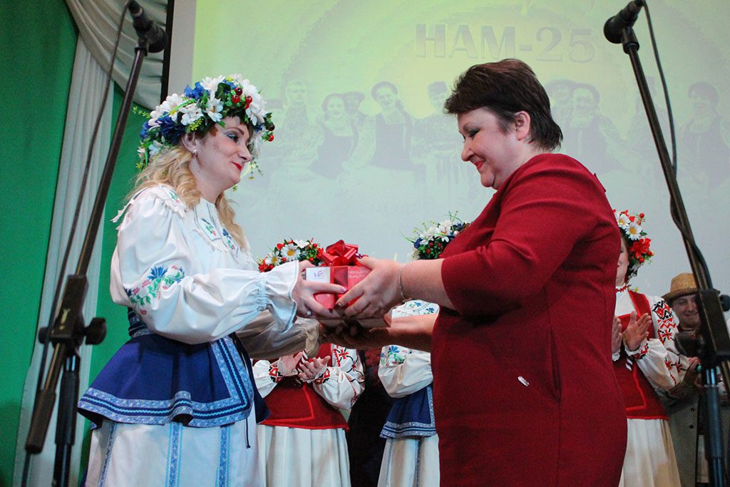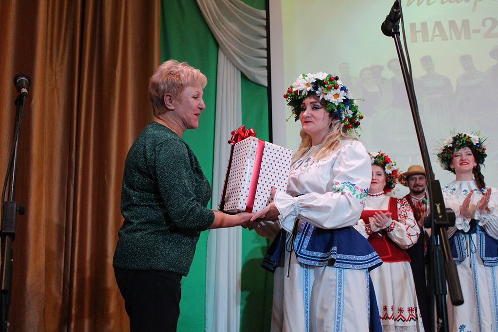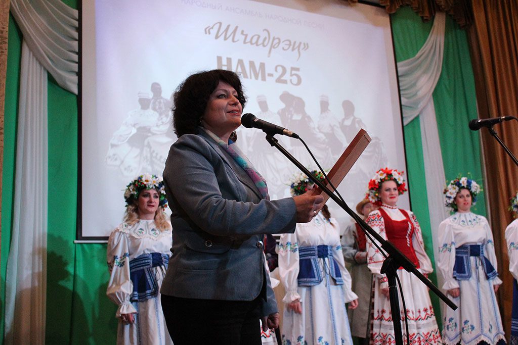 К поздравлениям и теплым словам, которые прозвучали в адрес коллектива-юбиляра, присоединилась председатель районного объединения профсоюзов Т.В. Корытко и вручила ансамблю «Шчадрэц» подарок.