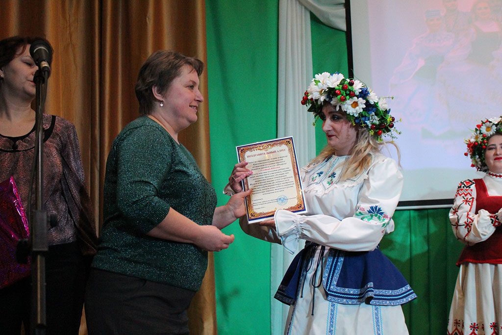 Директор ГУК «Централизованная клубная система Краснопольского района» Ю.П. Подолякин поздравил коллег, вручил грамоту народному ансамблю «Шчадрэц» за большой вклад в развитие и сохранение народного творчества и в связи с 25-летием со дня основания коллектива. За добросовестный труд, сохранение и популяризацию народного творчества и в связи с 25-летием со дня основания коллектива благодарности была удостоена аккомпаниатор ансамбля Т.М. Астапенко. Благодарности за активную деятельность по сохранению и популяризации песенного творчества и в связи с 25-летием Юрий Петрович вручил и участницам ансамбля А.В. Снытко, В.В. Юркиной, Н.Г. Поплыко.
