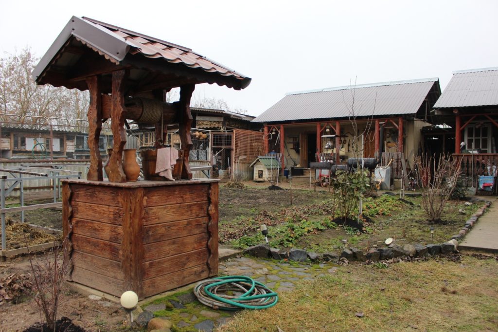 Отведено на участке место под грядки, спланированы цветочные клумбы (декоративная жимолость, крокусы, тюльпаны, лилии, хризантемы, пионы, розы и др.). Есть самодельный фонтан, мини декоративный колодец. На грядках посажено несколько сортов клубники, один из которых — гигантелла (стандартные плоды весят 50–60 г). Розетки (4 штуки) Оксана Николаевна покупала в России, размножала года два, чтобы получилась пара рядков. Растет ремонтантная клубника, которая плодоносит несколько раз за лето. Заботливый уход получают саженцы плодовых деревьев, в числе которых есть колоновидные, ягодных кустов, винограда. Несколько штук саженцев растут рядом с домом. Немаленький сад разбит на участке, взятом в аренду на 10 лет (он ещё совсем молодой, о плодах говорить рано, но можно представить, когда вырастет и зацветет весной, какая это будет красота, а осенью — урожай). Этот земельный надел является как бы продолжением участка при доме, что удобно. Сейчас он используется для выгула домашней живности.