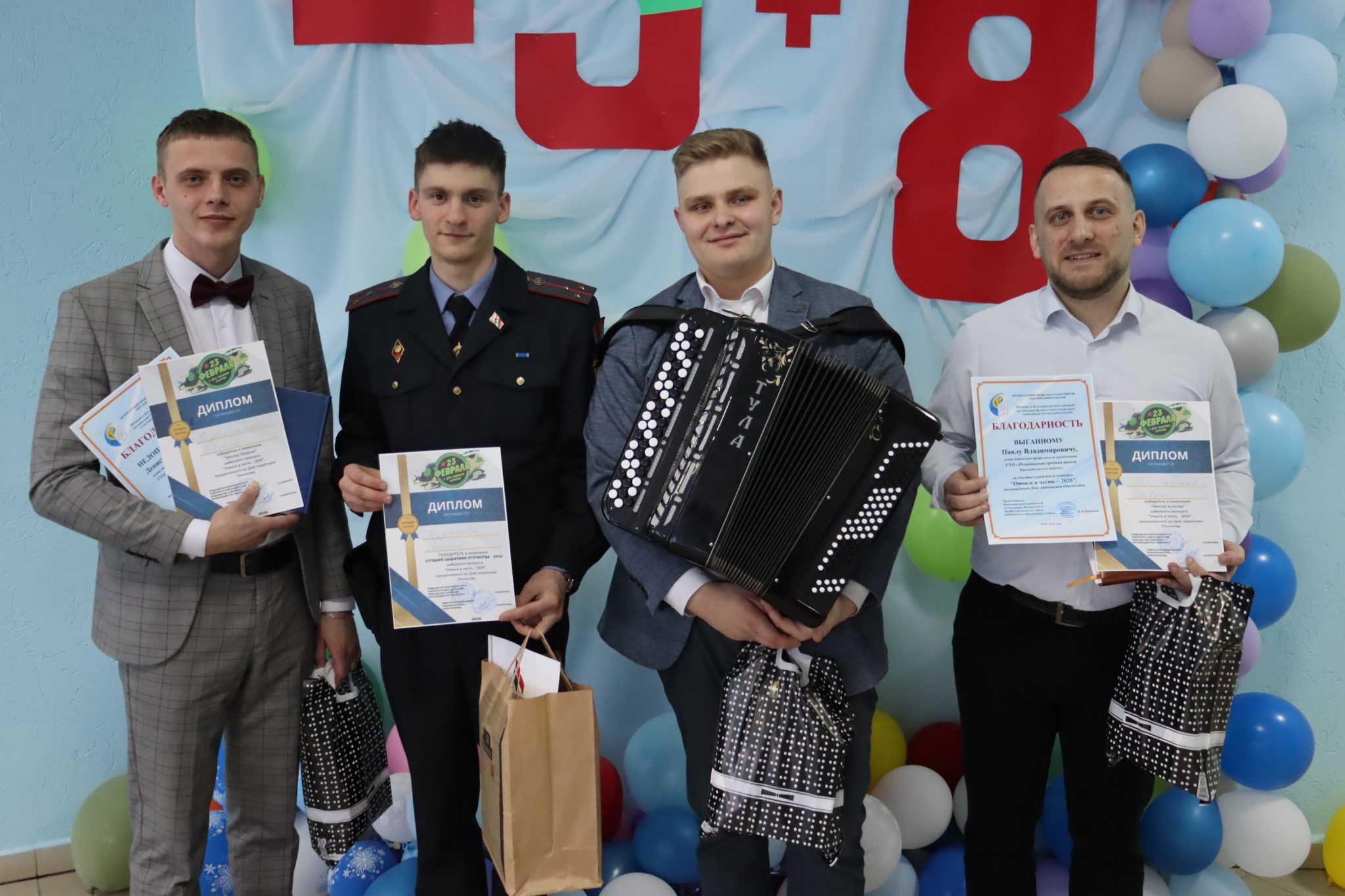 Диплом победителя в номинации «Мистер Кулинар» получил Павел Выгнанный. Номинацию «Мистер Обаяние» покорил Денис Недопытальский. Победителем в номинации «Мистер Талант» стал Роман Астапенко, а «Лучший защитник Отечества-2026» и победитель конкурса – Евгений Цудинович!