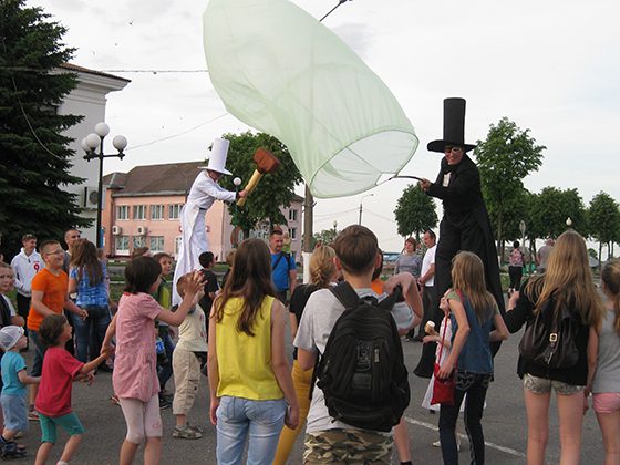 Всеобщее веселье и оживление вызвало появление на городской площади актеров уличного театра на ходулях «Веселые великаны» г. Могилева. Для краснопольского зрителя это было необычным зрелищем. Особенно бурное восхищение ими проявляли дети. Великаны-клоуны запускали для них надувные шарики, делая это с помощью специального устройства, отчего шарики летали, как торпеды, а ребятня носилась за ними гурьбой. Также делали из этих шариков, переламывая их и скручивая, различные фигурки. Еще ловили сачком зазевавшихся зрителей и не только. Ребятам очень понравилось такое общение с великанами. Да и взрослым тоже. Благодаря этим актерам все получили массу ярких впечатлений. Многие фотографировались с ними на память.