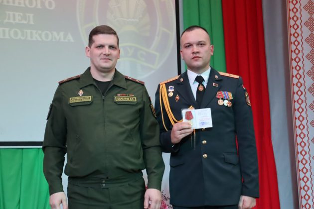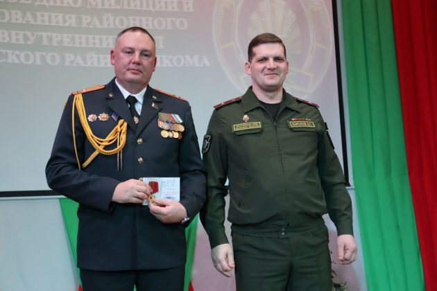 Военный комиссар Чериковского и Краснопольского районов майор Дмитрий Барсуков вручил полковнику милиции, начальнику РОВД Станиславу Кондратьеву и майору милиции, заместителю начальника РОВД Владиславу Кравченко медали «80 год вызвалення Рэспублікі Беларусь ад нямецка-фашысцкіх захопнікаў».