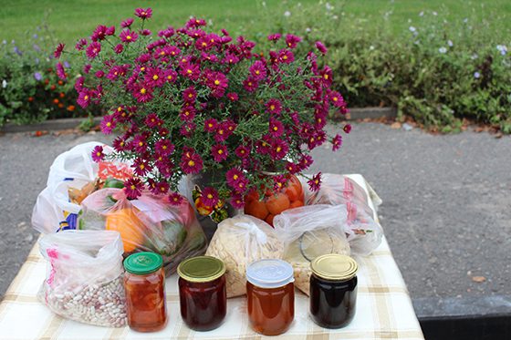 Жителям поселка предлагалось большое разнообразие овощей и фруктов, выращенных на приусадебных участках заботливыми руками хозяюшек. На столах, украшенных в соответствующей осенней тематике, стояли закатки, сушеная фасоль, тыквенные семечки, перец, капуста, молоко, зелень петрушки, морковь и многое другое.