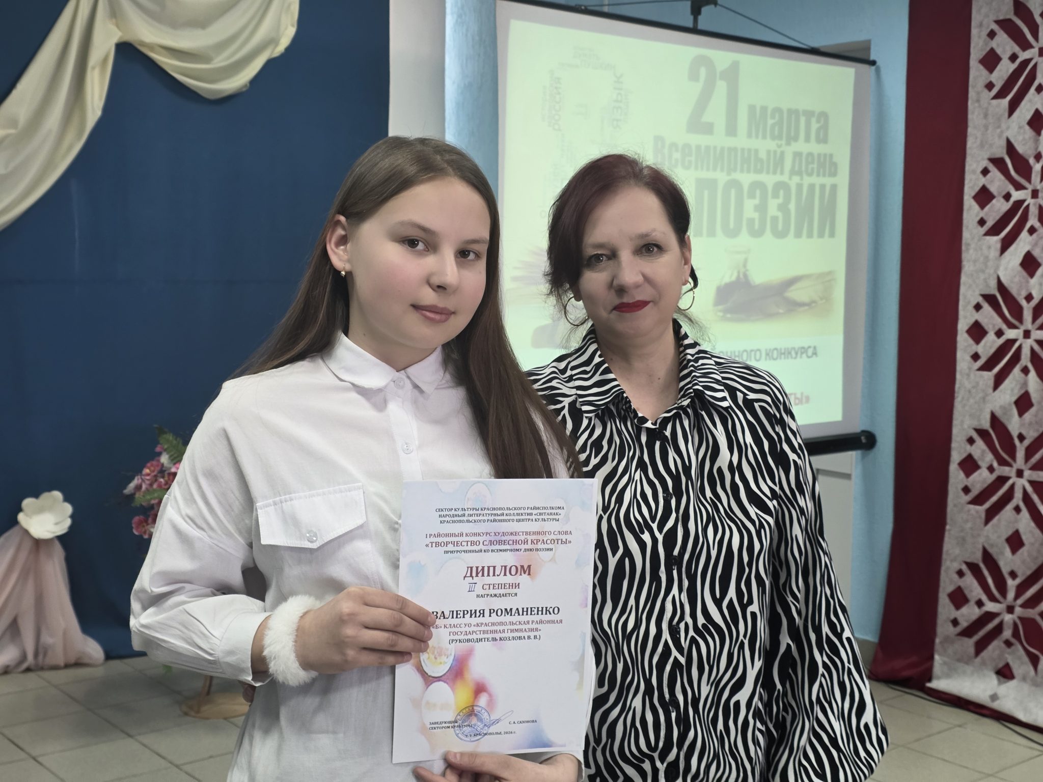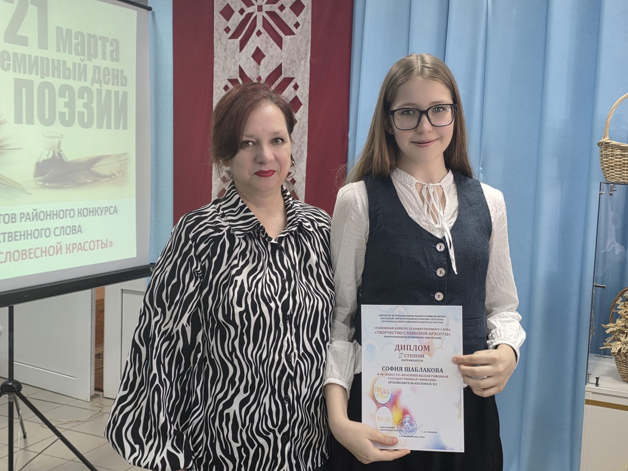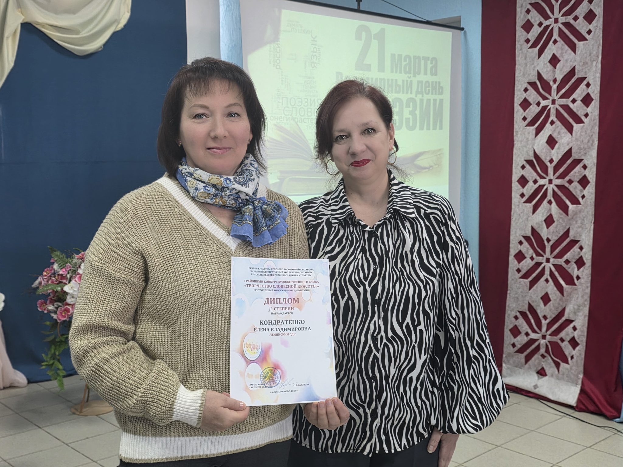 19 марта в Краснопольском районном Центре культуры для гостей и любителей поэзии была гостеприимно распахнута дверь поэтической гостиной под названием «Дышат поэтической строкой» и состоялся 1-й районный конкурс художественного слова (конкурс чтецов) «Творчество словесной красоты».