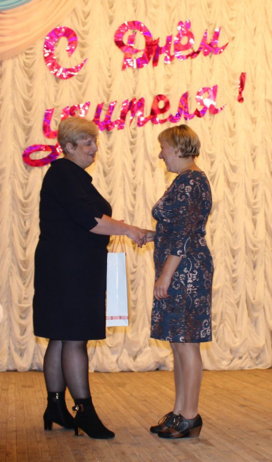 С профессиональным праздником учителей поздравила заместитель председателя райисполкома Е.И. Чаюкова. Елена Ивановна пожелала всем, для кого смыслом жизни стало воспитание подрастающего поколения, крепкого здоровья, неустанного творческого горения, успехов, прекрасного настроения и вручила Благодарности Краснопольского райисполкома учителю русского языка и литературы ГУО «Яновский УПК детский сад-средняя школа» Н.В. Козик за активное участие в продвижении социальных инициатив для повышения устойчивости развития системы образования Краснопольского района, заместителю заведующей по основной деятельности ГУО «Ясли-сад №2 «Солнышко» г.п. Краснополье» Е.А. Котяговой за вклад в создание условий, обеспечивающих высокий уровень воспитания и обучения детей дошкольного возраста, совершенствование воспитательного процесса, развитие творческого потенциала, профессионального роста педагогов, заведующему отделом декоративно-прикладного творчества и изобразительного искусства ГУО «Краснопольский районный центр детского творчества» Л.А. Булове за вклад в развитие детского декоративно-прикладного творчества, эстетической культуры и творческого потенциала детей и молодежи.