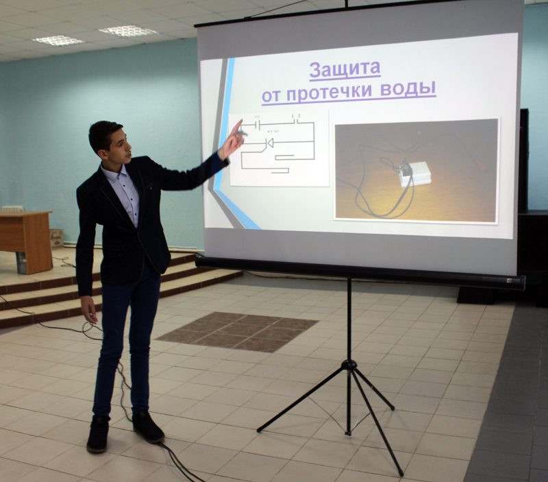 Первыми свой проект представляли Р. Новиков и М.А. Терехов. Они модернизировали автономный пожарный извещатель, оповещающий не только о задымлении, но и об утечке угарного газа и протечке воды.