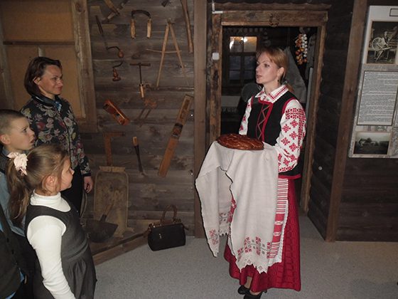 В роли хозяйки дома выступила научный сотрудник Е.В. Василькова, которая по традициям встречала гостей хлебом-солью и познакомила ребят с обустройством крестьянского дома конца XIX начала XX века. Несмотря на то, что изба чаще всего состояла из одной комнаты, она условно делилась на несколько зон.