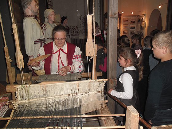 Огромный интерес у ребят вызвал ткацкий станок (кросны) за которым работала работник районного дома ремёсел Мукалова В.Н.. Валентина Никандровна ознакомила ребят с основным оборудованием необходимым для ручного ткачества и рассказала о том, как с помощью ткацкого станка изготавливали ткани из которых потом шили одежду.