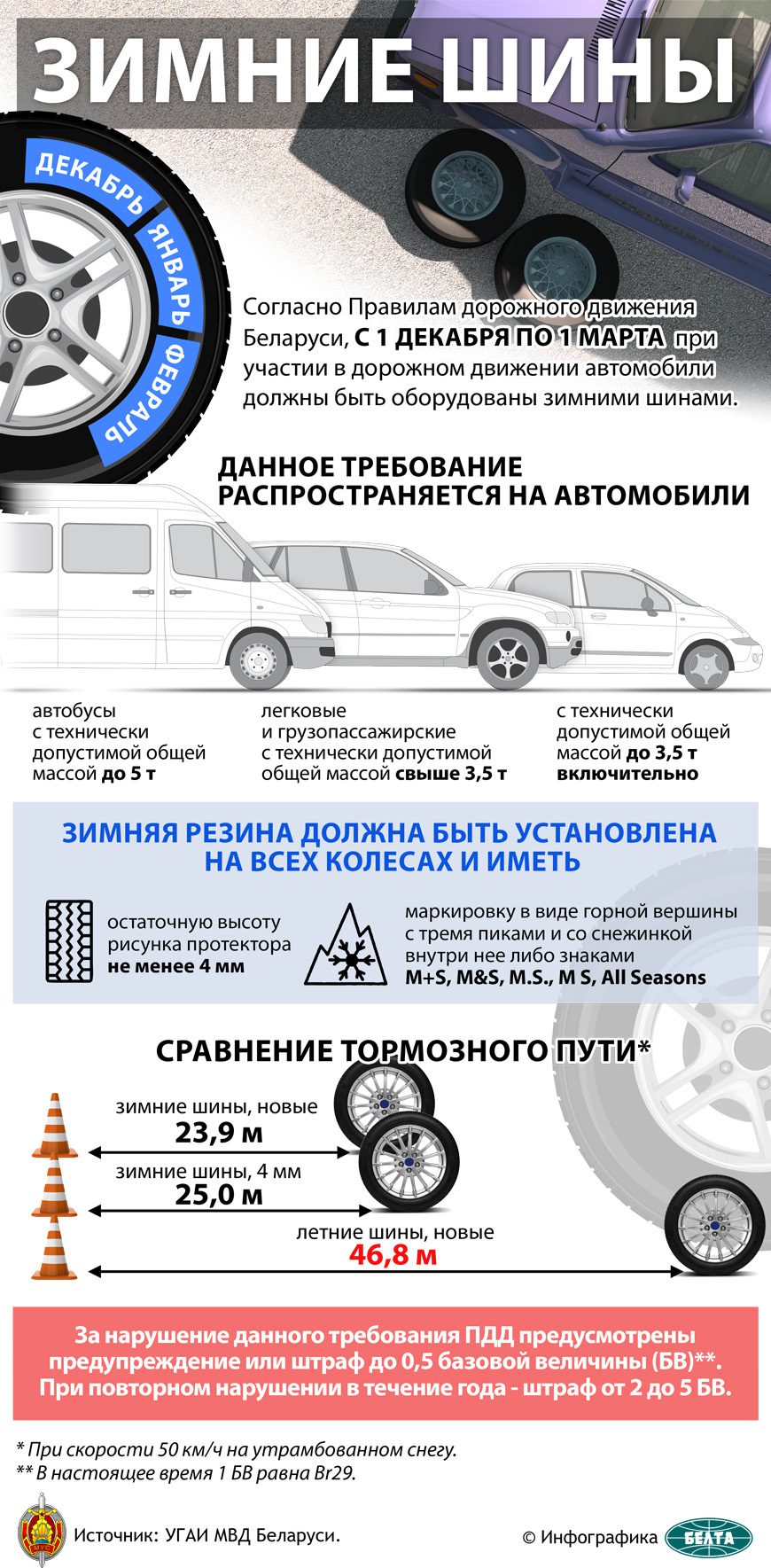 Госавтоинспекция напоминает, что с 1 декабря по 1 марта при участии в дорожном движении автомобили должны быть оборудованы зимними шинами.