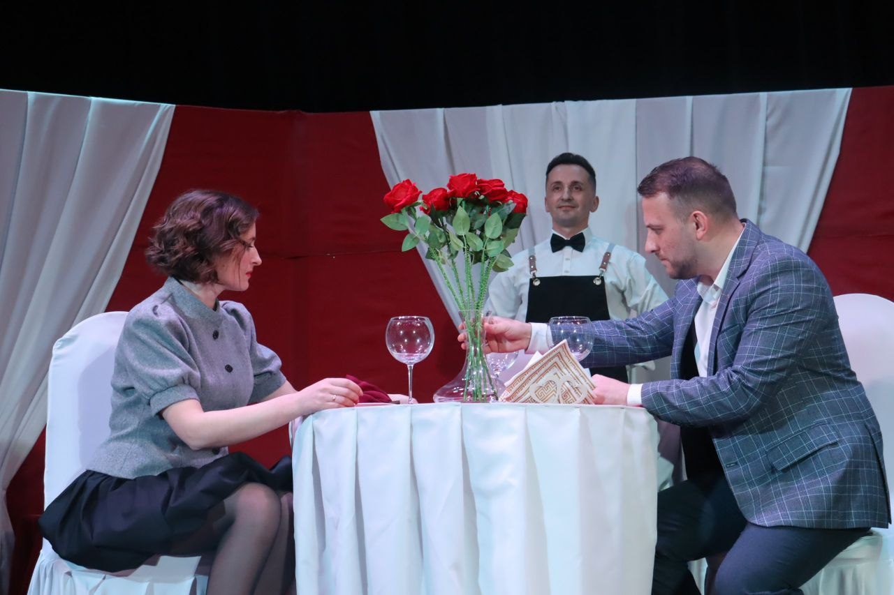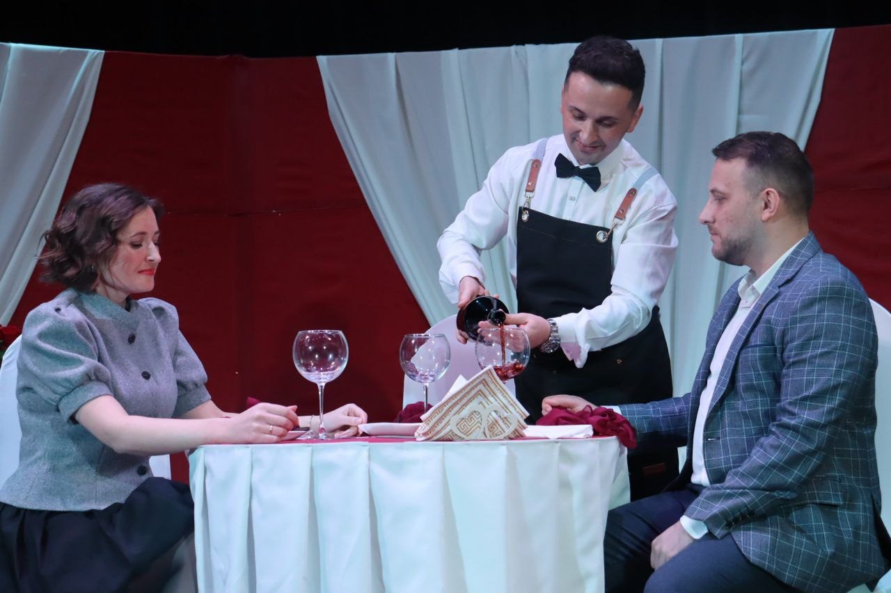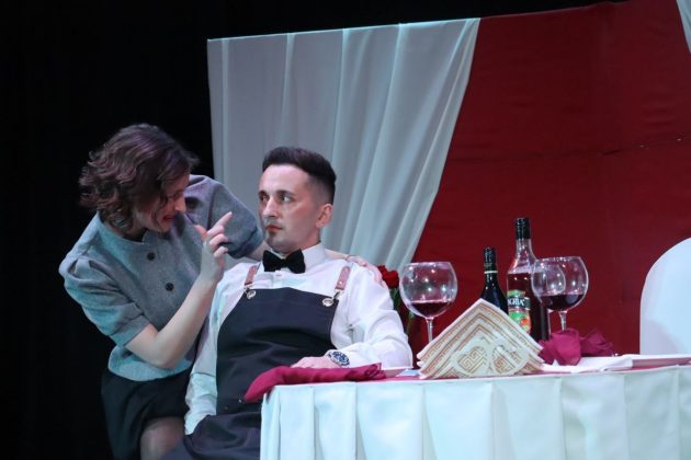 На этот раз постановка смогла по-настоящему заинтриговать зал – за столиком молодая пара, а третье место – пустое, что стало важным акцентом в спектакле. В роли официанта еще и психолог, что добавило тонкой иронии и новых смыслов в происходящее.