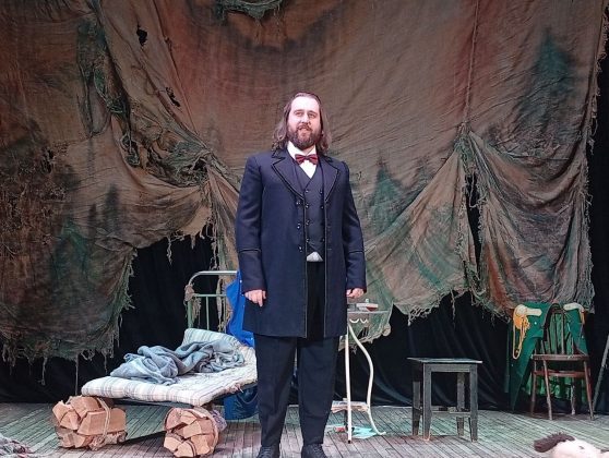 «Для меня было сложно вжиться в роль идиота. Во-первых, сценический образ – спортивные штаны с лампасами, туфли «нулевых» лет, шапка а-ля СССР, вязаная кофта и водолазка. Я все время думал, как мне себя вести. Ситуация, в которой я очутился, требовала приземленности и ловкости действий: скорее загрести себе не только квартиру, но и все, что в ней находится. Как видите, мой герой – еще тот фрукт.