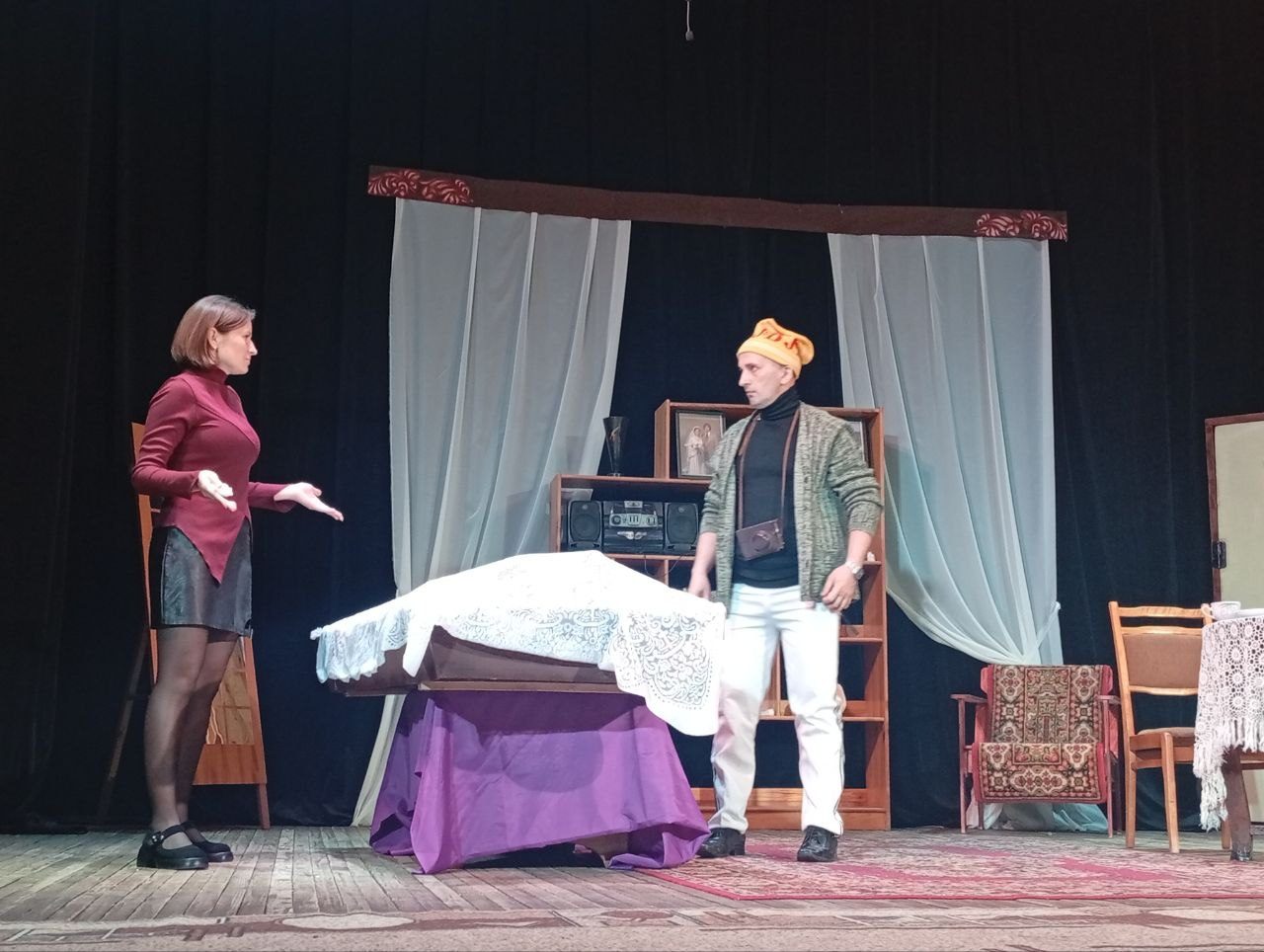 Во второй день театральной недели зрители имели возможность еще раз насладиться игрой актеров народного театра Краснопольского РЦК в спектакле «Столик на троих». Эта пьеса нам уже знакома. Премьера выходила в прошлом году в рамках международного фестиваля любительских театров «Театральныя вечарыны».