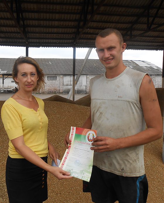 НА СНИМКЕ: председатель райкома профсоюза работников АПК И.О. Василенко объявляет Алексею Терехову благодарность за перевезенную тысячу тонн зерна от комбайнов и вручает денежную премию.