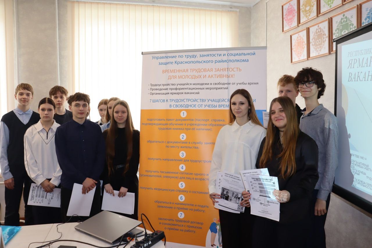 На Краснопольщине в первый день ярмарки — 13 апреля — учащимся 9–11 классов районной гимназии рассказали о существующих вакансиях организаций и предприятий района на сегодняшний день, а также о занятости подростков в летний период. Речь шла об участии в студенческих отрядах и о возможностях трудоустройства в организациях района.
